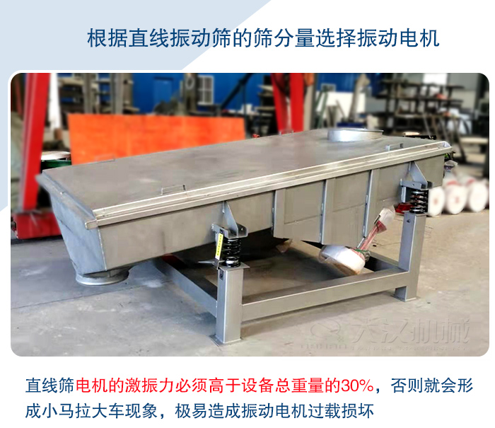 按照專業(yè)的計算方法來說,直線篩電機的激振力必須高于設備總重量的30%,否則就會形成小馬拉大車現(xiàn)象,極易造成振動電機過載損壞。。這里說的設備總重量指的是直線篩的減震彈簧以上的參振部分的總重量加上承載物料后的中重量,這樣才能保證篩面上的物料有充分的受力在篩面被拋起篩分。